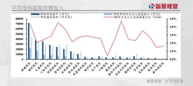这些都会体现在建院成本上面。如下图所示,2019年,国内肿瘤医院的单院平均资产为7.17亿元,单院平均万元以上设备投入为2.26亿元,单院平均建筑面积为4.4万平方米,均显著高于其他专科医院。