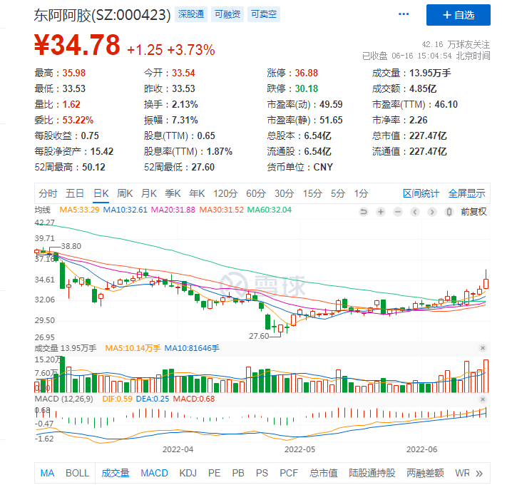 从上述两组数据不难看出,东阿阿胶似乎已经填完了在秦玉峰的阿胶价值回归工程下产生的渠道库存窟窿,迎来了正常的经营发展状态。而东阿阿胶的这一转好趋势,反映到资本市场,直接表现为股价的稳步回升,截止6月16日,东阿阿胶的收盘价为34.78元/股,当日涨幅3.73%。