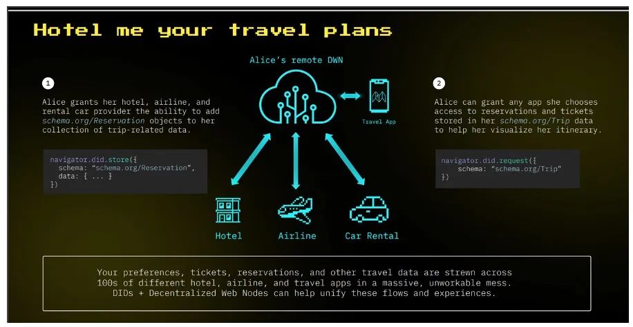 在这个例子中,Alice拥有一个数字钱包,可以用其安全地管理自己的身份、数据以及对外部应用程序和连接的授权,这些数据跨平台存在,被保存在个人的去中心化网络节点中。