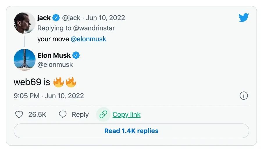 在一位网友表示“如果Jack和比特币可以创造Web5的话,那基于狗狗币就可以创造Web69”的调侃推文下,Jack Dorsey艾特了马斯克,并表示“你的事儿来了(Your move)”,马斯克也乐在其中,积极地给予了回应还配了要火的表情。