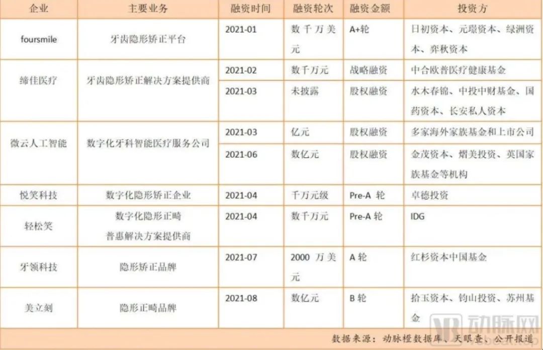 一级市场也不例外。今年以来,正雅齿科、牙领科技相继完成了新一轮融资。回溯过去几年,高瓴、红杉、中金、DMC中国、泰康投资等国内投资机构都纷纷出手了口腔正畸项目,甚至于百度、字节跳动也在2021年有所布局。
