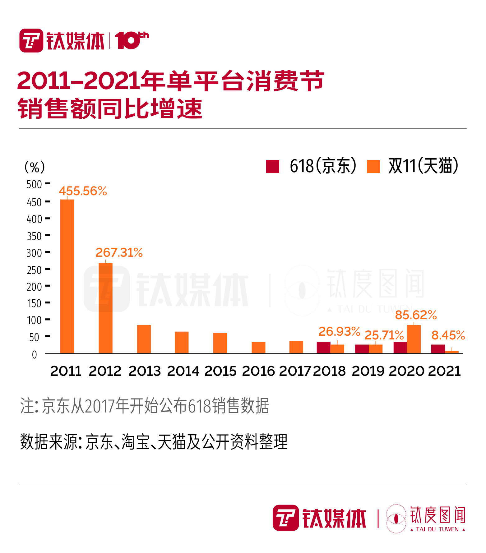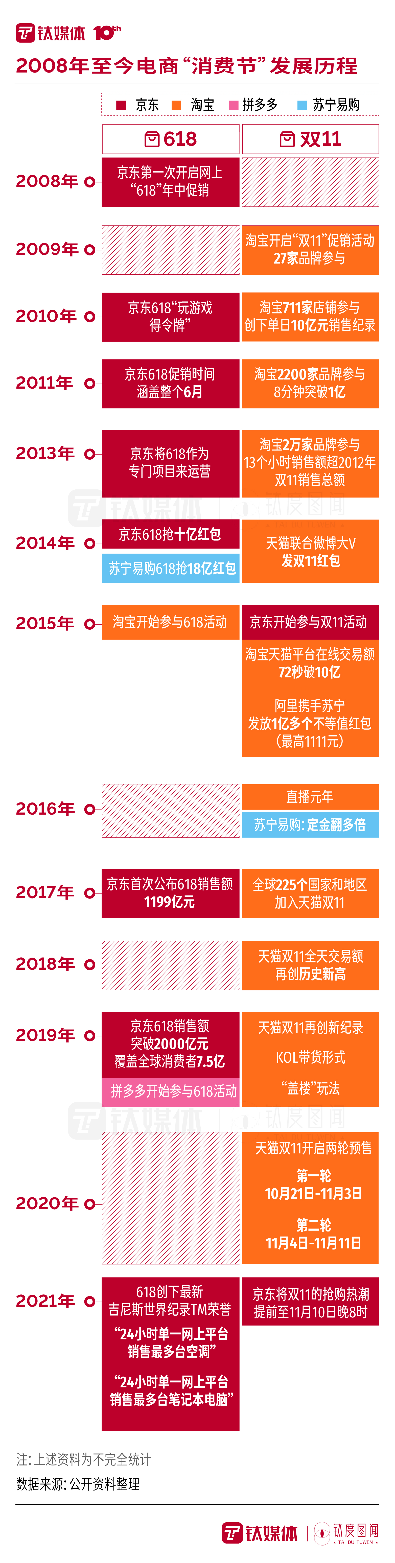 据钛媒体·钛度图闻公开资料整理,“618”、“双11”消费节出现至今,至少有苏宁易购、拼多多、蘑菇街、唯品会等电商平台相继入局。但最有看点的比拼,还是两个消费节创办者——京东、天猫(此前的淘宝商城)的“反向操作”。