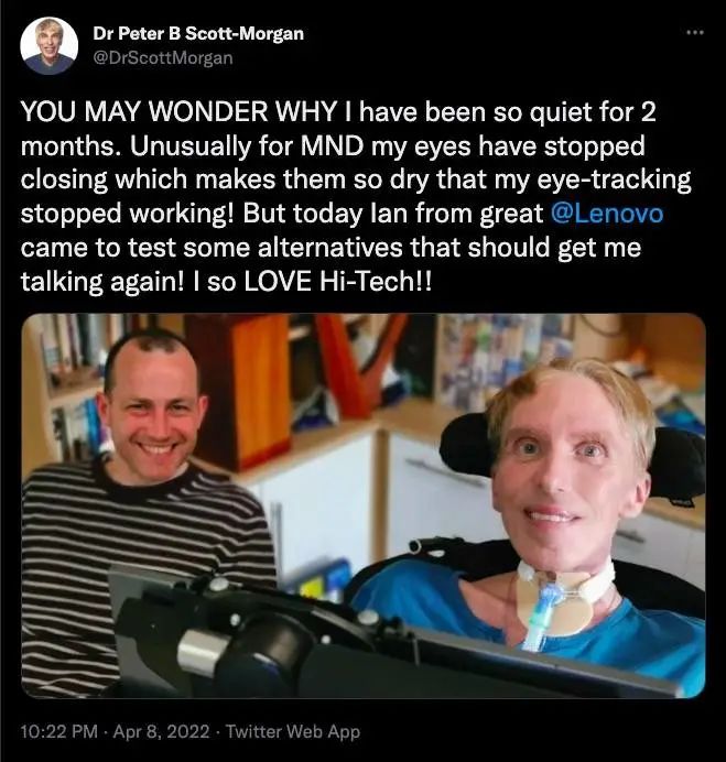 今年 1 月接受 DXC Technology 线上采访时,彼得全身上下只剩大脑和眼睛可正常活动,他这么说:
