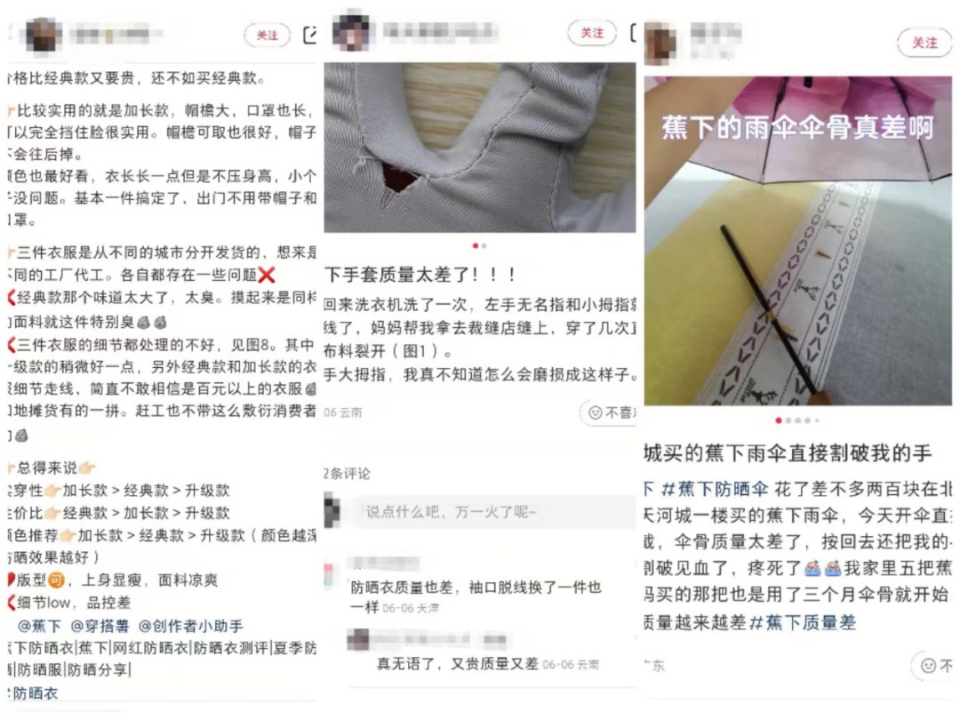 不过,走“奢侈”路线的蕉下,产品质量没少被消费者吐槽,比如防晒伞的伞架断掉,防晒衣味道臭、走线差,“和地摊货有一拼”,手套脱线、布料裂开等。