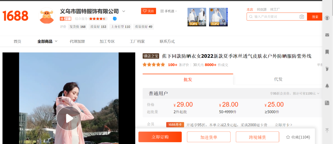 1688平台上,有企业售卖蕉下同款防晒衣
