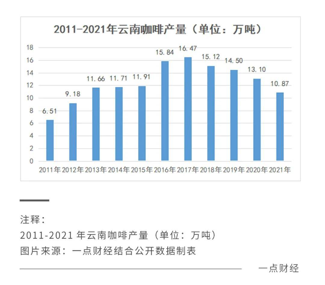 作为中国的咖啡主产区,国内99%的咖啡豆产量源自云南,从2011年的6.51万吨到2021年的10.87万吨,十年间云南咖啡产量增长了67.0%。这些产量多数被国内市场消费掉,2021年云南咖啡出口量为3万吨,而这一数据在2017年时为6.07万吨。