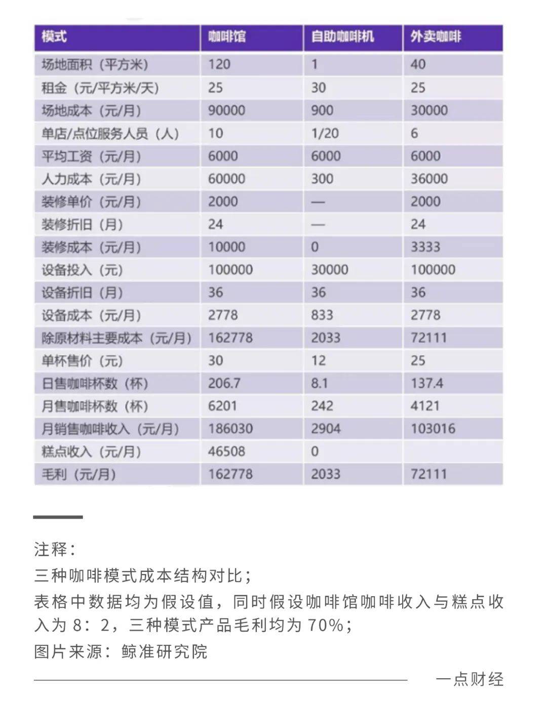 依据鲸准研究院提供的数据计算,咖啡馆、自助咖啡机、外卖咖啡的产品毛利率均在70%左右。此外一位有经验的咖啡从业者曾向媒体透露,单杯拿铁普遍成本在6元上下,以30元售卖计算,产品毛利率约80%。