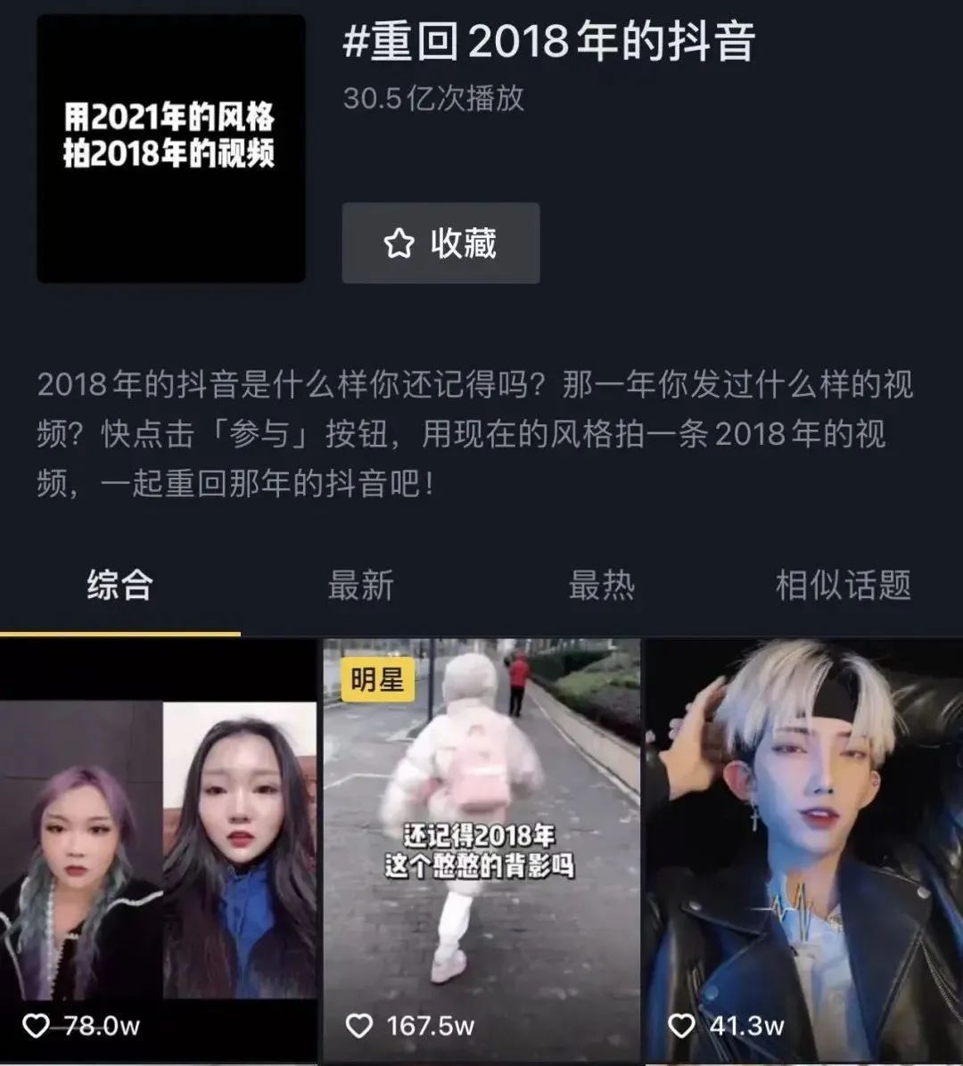 在抖音上,#重回2018年的抖音#话题播放量已经高达30亿次;不少抖音相关的文章评论区,“怀念技术流时期的抖音”之类的言论层出不穷;以“抖音考古君”为代表的搬运几年前抖音视频的博主,轻松聚集了十几万粉丝一同怀念过往。