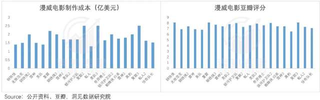 举例来说,漫威从2008年系列第一部开始,流水线批量生产下,平均每年有2-3部影片上映,且标准化下,影片质量保持在一定的水准之上。如下图,其20部影片中,82%的影片豆瓣评分都在7分以上。