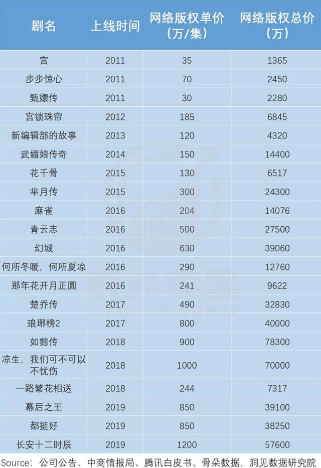 如下图,头部剧集《如懿传》、《幻城》等,同样是大制作投入——比如,腾讯购买《如懿传》版权花费了7.8亿,但这些剧集每元钱获取的播放量都在100以下,甚至《如懿传》为个位数,显然无法覆盖制作投入。