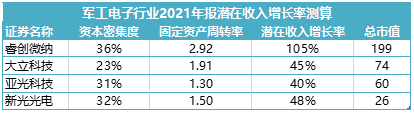 符合条件的军工电子上市公司,市值最大的是睿创微纳,2021年的资本密集度是36%。