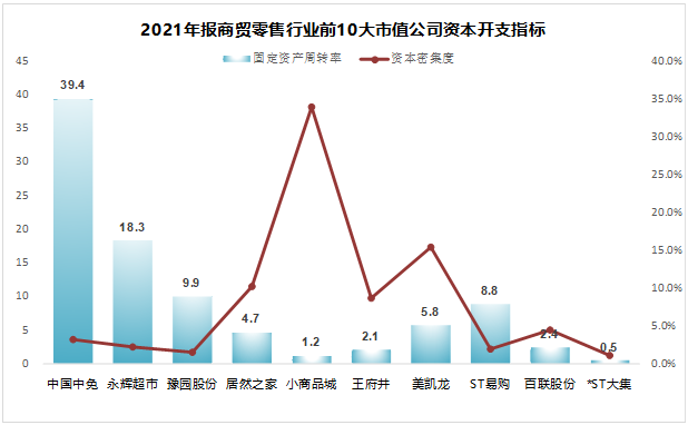 从A股上市公司的数据来看,2021年中位数的资本密集度度为6.3%,这个数字总体并不高,因为我们A股上市公司营业收入中折旧摊销的占比,在2021年平均是5.6%,这代表上市公司总体的资本开支,刚刚好能够覆盖折旧摊销这种维持简单再生产所需要的水平。