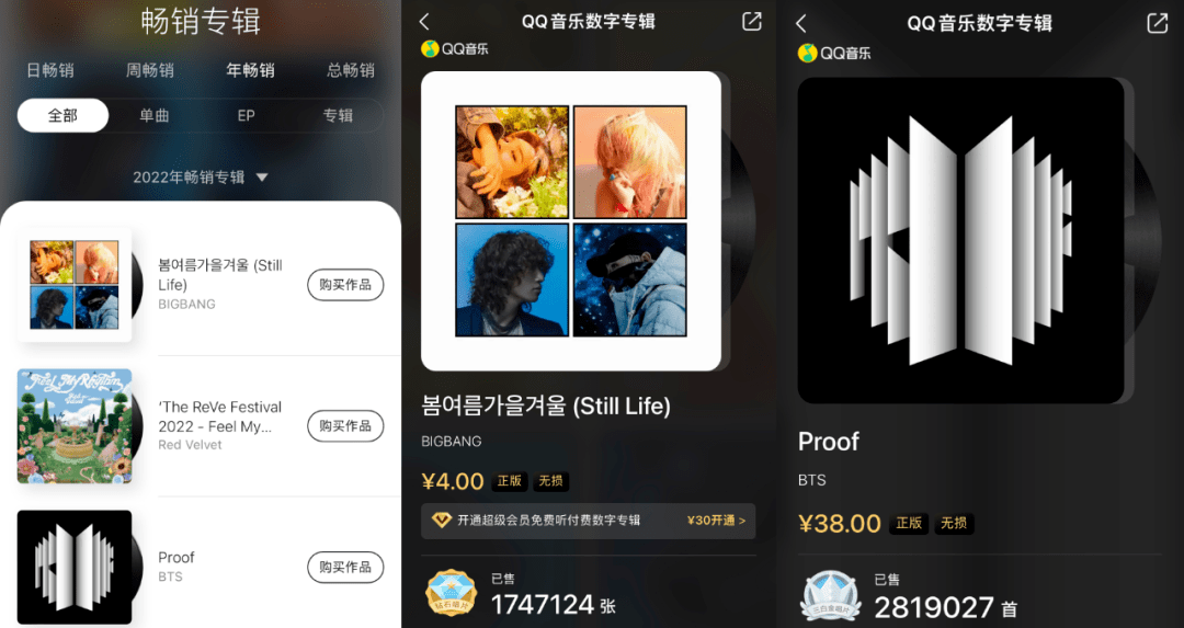 去年限购令后,君不见往日各家流量粉厮斗销量的氪金竞赛,2022年华语歌手们发数专的积极性明显受挫。翻开QQ音乐的2022年畅销专辑榜,你也许会错觉进了哪个K-pop野榜,榜单前列皆是BIGBANG、BTS、SUPER JUNIOR等韩团新专,虽然他们中销量最高的BTS也只卖到281万张的体量,与过往动辄卖几千万张的数专盛世不可同日而语。