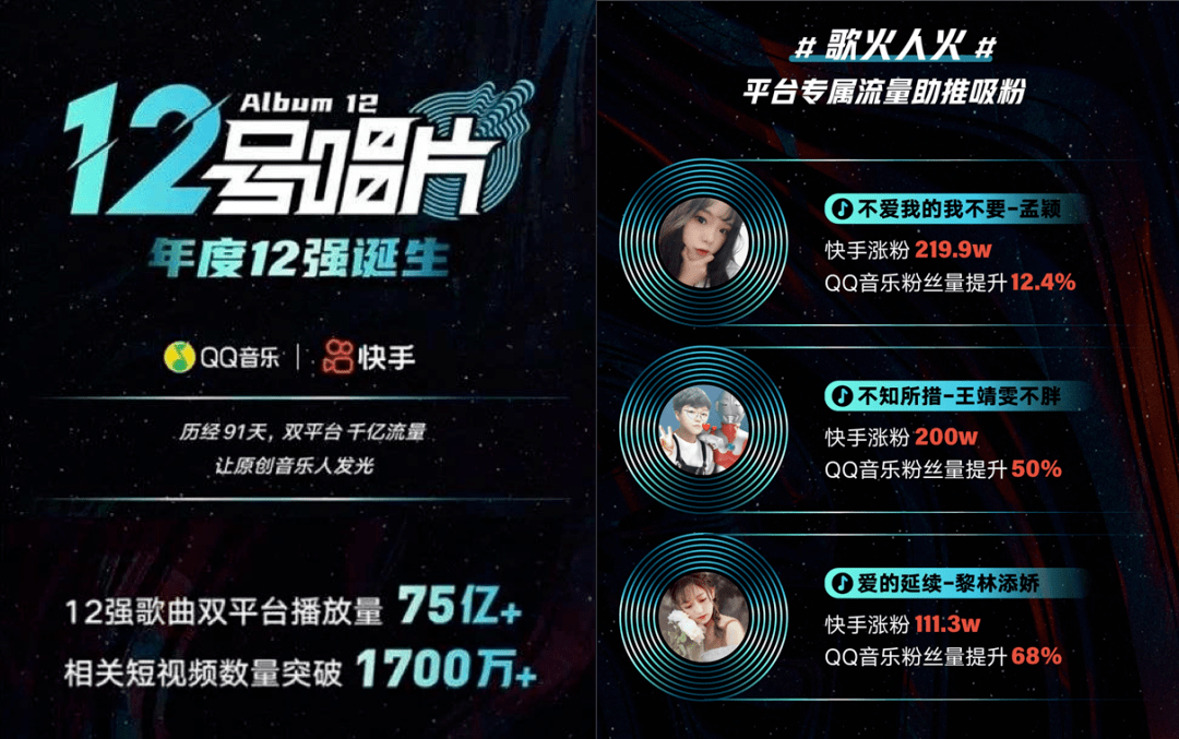这么多年,帮助海量原创音乐人出数专的各类“扶持计划”是各家内容平台发力音乐赛道的一个主旋律。比如,快手联合QQ音乐打造的两季“12号唱片”企划,酷狗音乐推出的为音乐人出唱片的“星曜唱片计划”等,都在切实用数专的作品形式帮助原创音乐人。