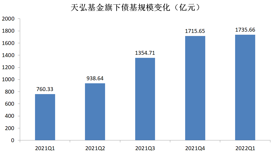 从数据上看,去年第一季度,天弘基金旗下债基规模仅有760.33亿元,到今年第一季度已增长至1735.66亿元,短短一年间增长了近1000亿元。