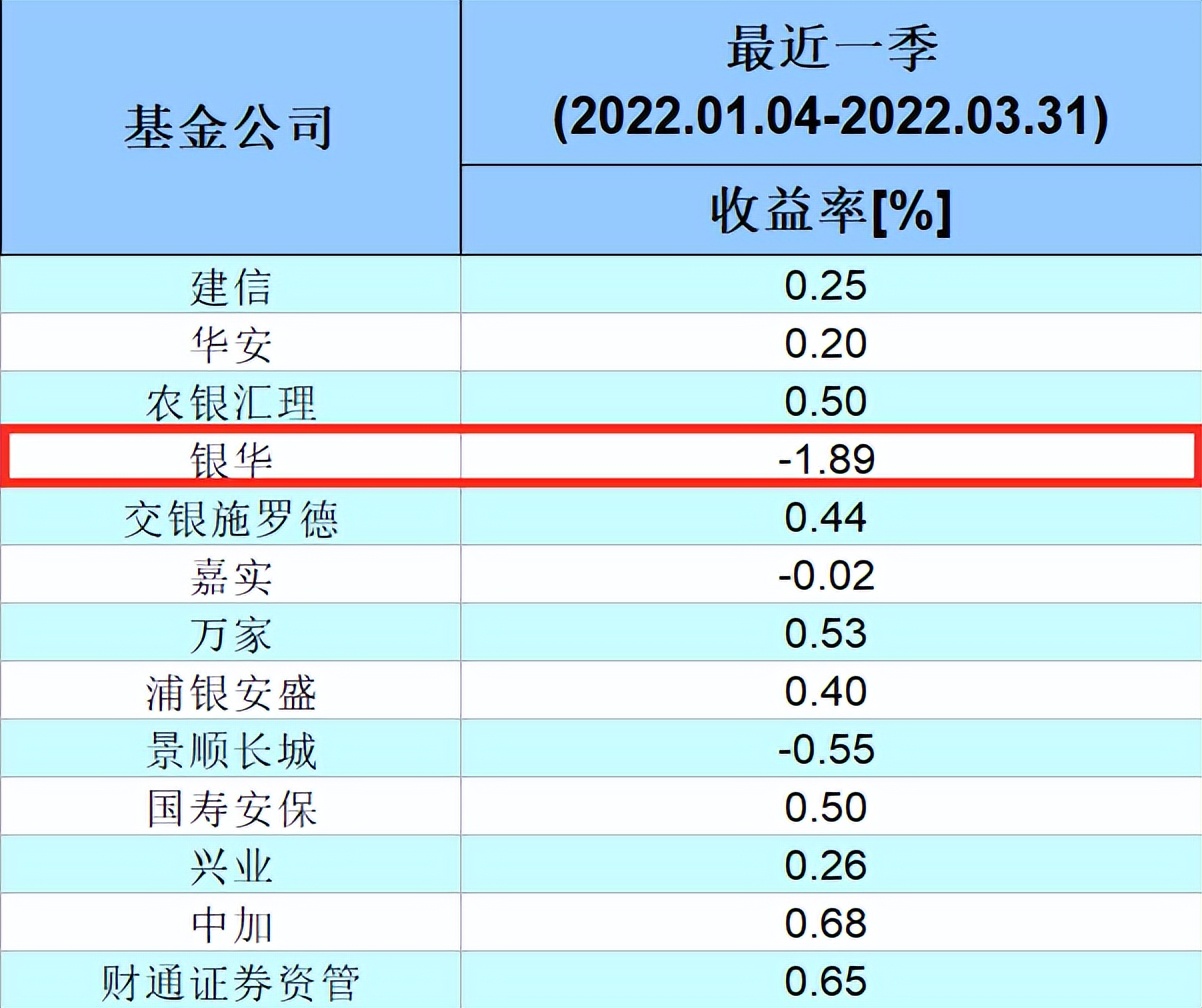 海通证券金融产品研究中心发布的公募基金十年绝对收益率榜显示,在固定收益类中型公司今年第一季度的排名中,银华基金以-1.89%的收益率排名倒数第一。