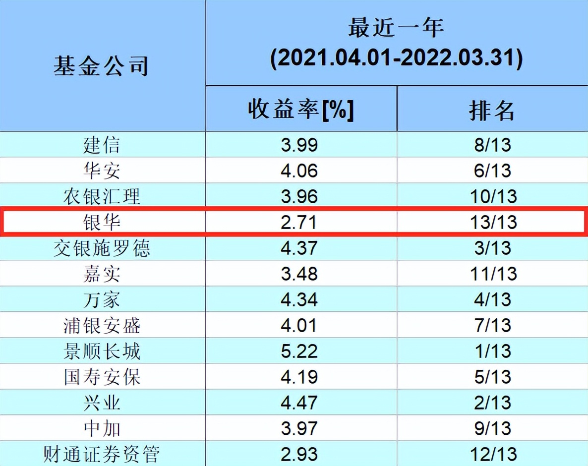 根据海通证券金融产品研究中心发布的公募基金十年绝对收益率榜显示,在固定收益类中型公司最近一年的排名中,银华基金排在倒数第一。