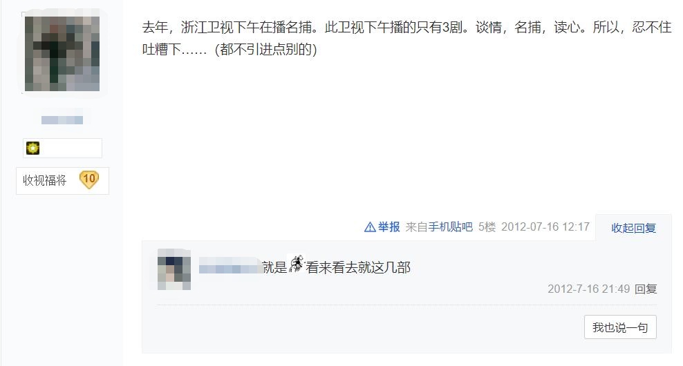 台剧和港剧也是下午档常客。浙江卫视在2011年、2012年的下午,时常会重播《谈情说案》《读心神探》,愣是播成了当年白天档冠军,也让吧友开始吐槽:都不引进点别的?湖南卫视这两年的下午档常客则是更名为《爱上琉璃苣女孩》的《命中注定我爱你》,2012年3月有吧友吐槽:这都播了第N遍了吧?