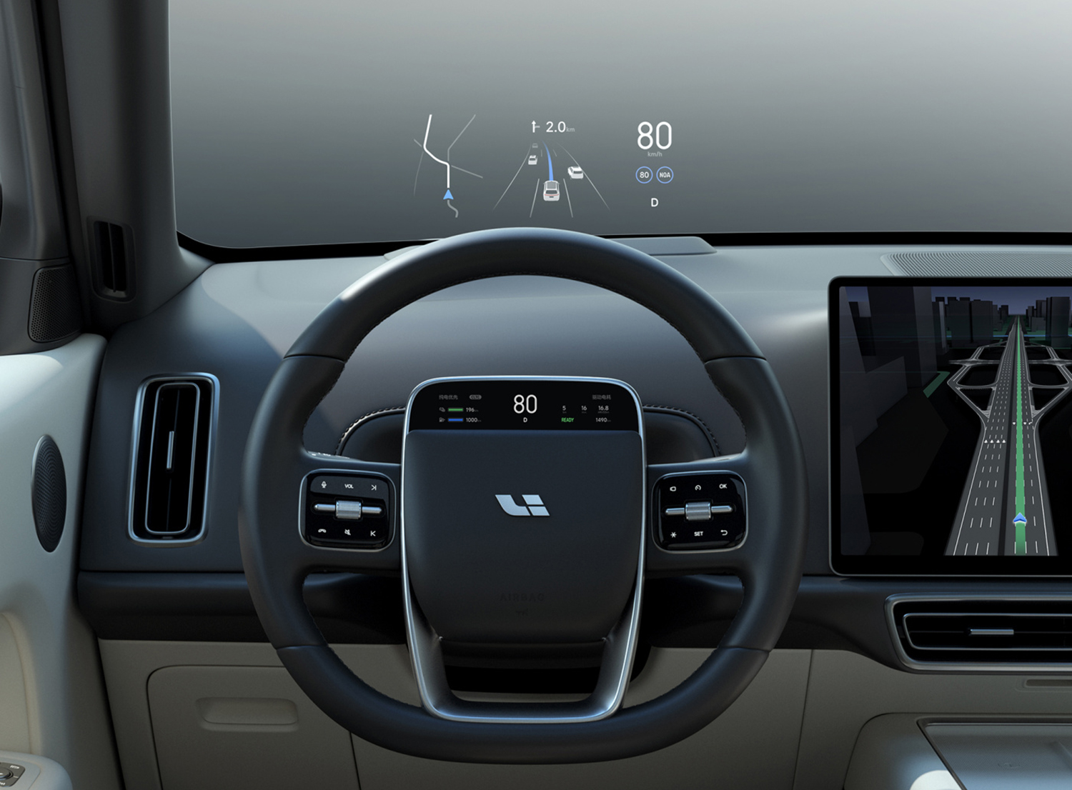 此前最受网友关注的安全驾驶交互屏,也是首次公开了其点亮后的效果。该屏幕可以呈现驱动模式、续航里程、当前时速、挡位、能源消耗等全方位车辆信息。同时其采用Mini-LED和多点触控技术,不但可以清晰地显示必要行车信息,还可以让仪表屏实现触控式交互。
