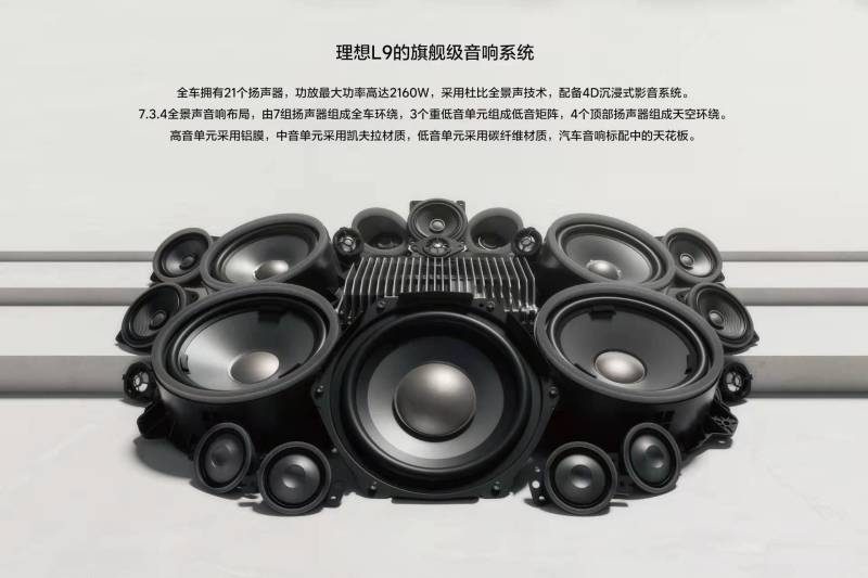 音响方面,理想L9的音响系统是由原Dirac中国区首席调音团队负责,标配21个扬声器,外放功率达到2160W。理想L9车内采用7.3.4全景声音响布局,由7组扬声器组成全车环绕,3个重低音单元组成低音矩阵,4个顶部扬声器组成天空环绕,力求带来更好的车内聆听体验。