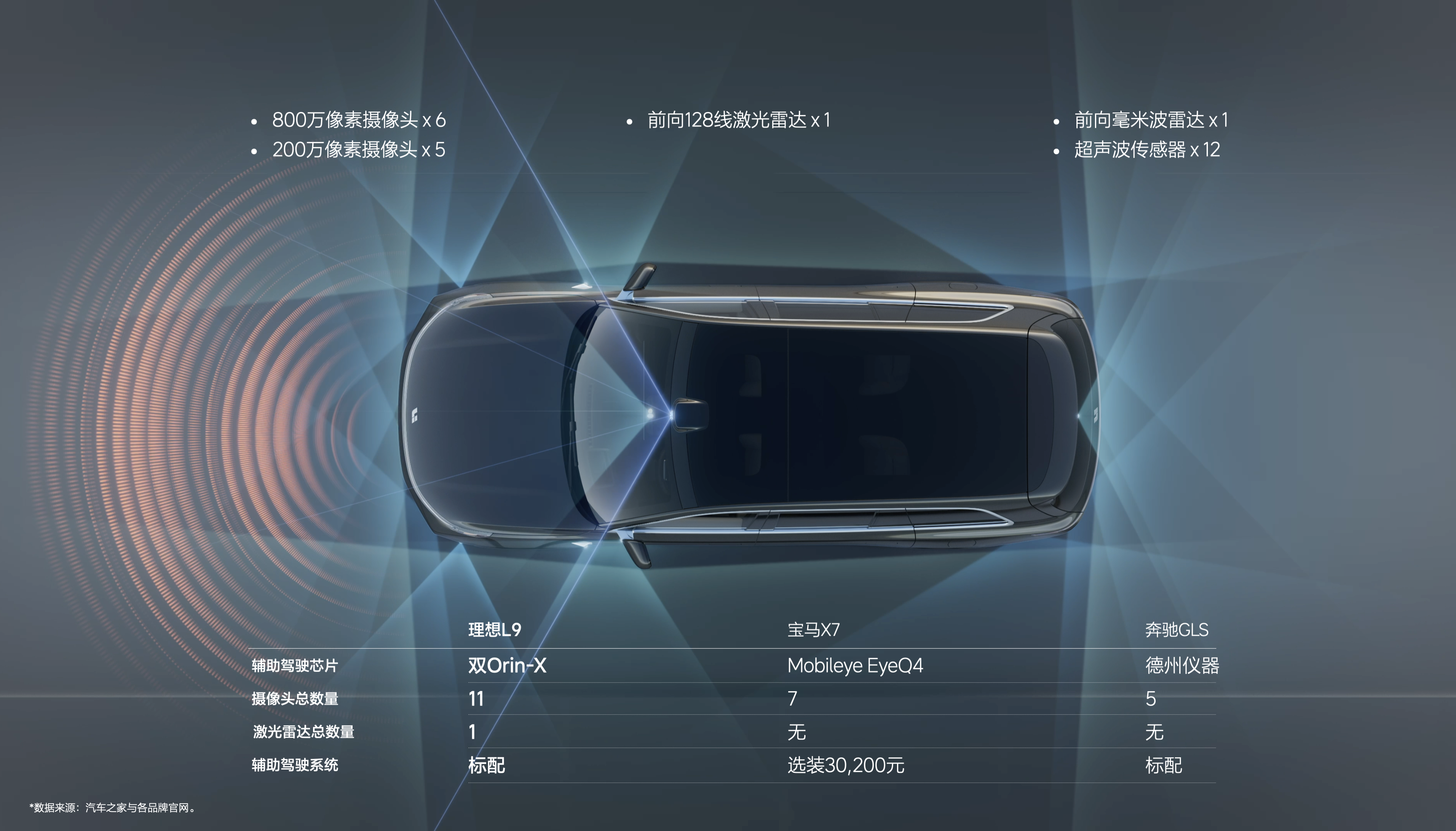 值得注意的是,在理想L9的车头上方有一处独特的“凸起”,该装置正是来自禾赛科技提供的混合固态128线激光雷达,可以发射 905nm波长的光束实现极高精度的空间感知能力。同时,理想L9采用高性能摄像头作为主要感知来源,硬件包括6颗800万像素摄像头和5颗200万像素摄像头,实现对车身周围及远距离的360°全方位感知。