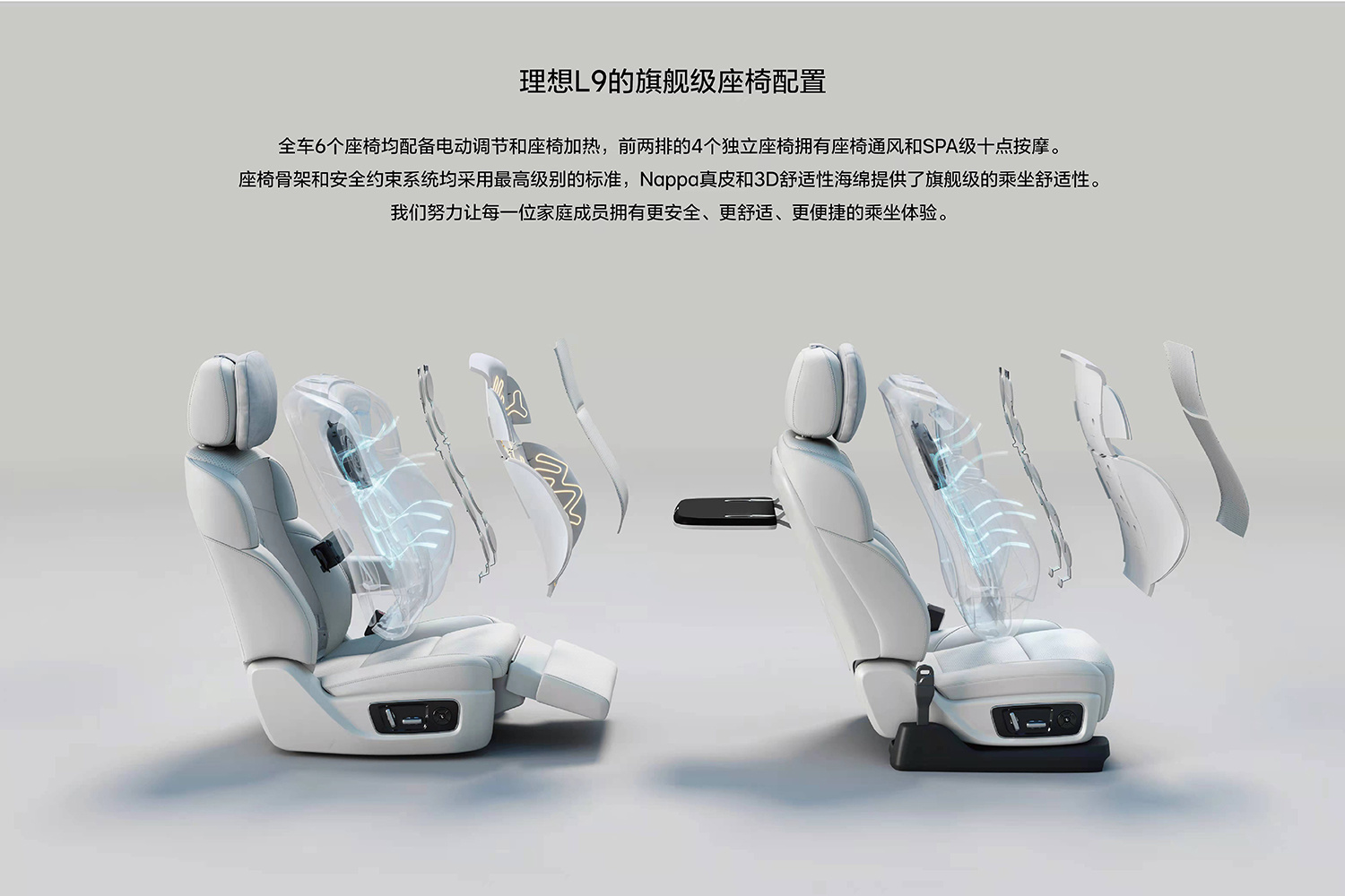 此外,理想L9全车6个座椅均配备电动调节和座椅加热,前两排的4个独立座椅还拥有座椅通风和按摩功能。所有座椅将包裹Nappa真皮,填充的3D舒适型海绵也将带来不错的乘坐体验。