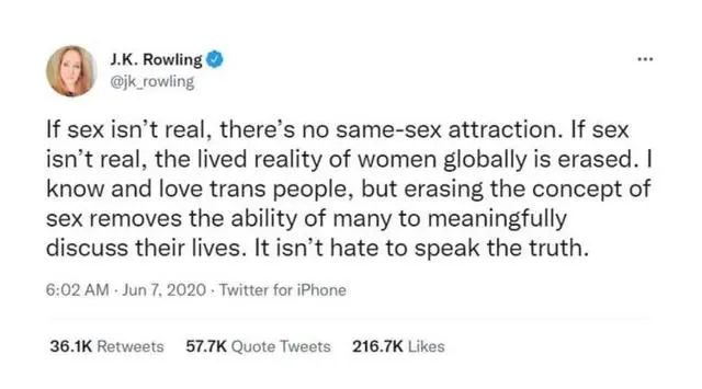 JK罗琳对此解释:“如果生理性别不存在,那就没有同性相吸,那么全球女性的生活体验也就会被抹去。我理解并尊重跨性别者,如果你因为性别遭到歧视,我会与你站在一起。但剥夺生理性别的概念会让很多人不能有意义地讨论他们的生活。”
