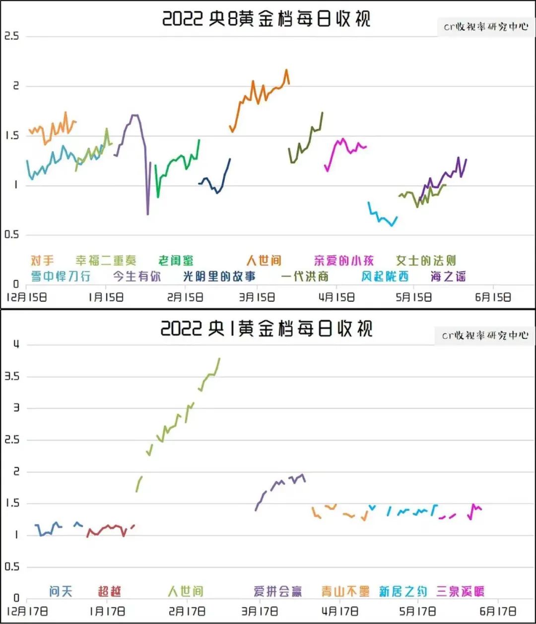 但咱们用数据说话,CVB诞生两年半时间内,每年的收视年冠成绩可是不降反增的。2020年的年冠是东方卫视的《安家》,创造过超越央视的平均收视率2.1%;2021年的年冠是CCTV1的《跨过鸭绿江》,以2.6%的平均收视率继续走高;今年上半年的年冠是CCTV1的《人世间》,又以2.8%的平均收视率创了央视近8年新高。