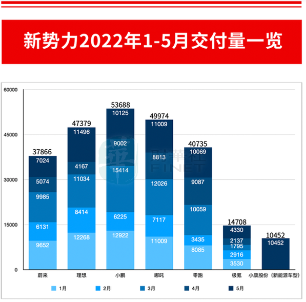 其中小鹏汽车累计交付53688辆;哪吒汽车累计交付49974辆;理想汽车累计交付47379辆,此前头部阵营的“蔚小理”的格局被打破改写。