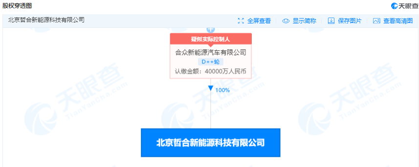 天眼查的股权穿透显示,该公司由合众新能源汽车有限公司100%控股。
