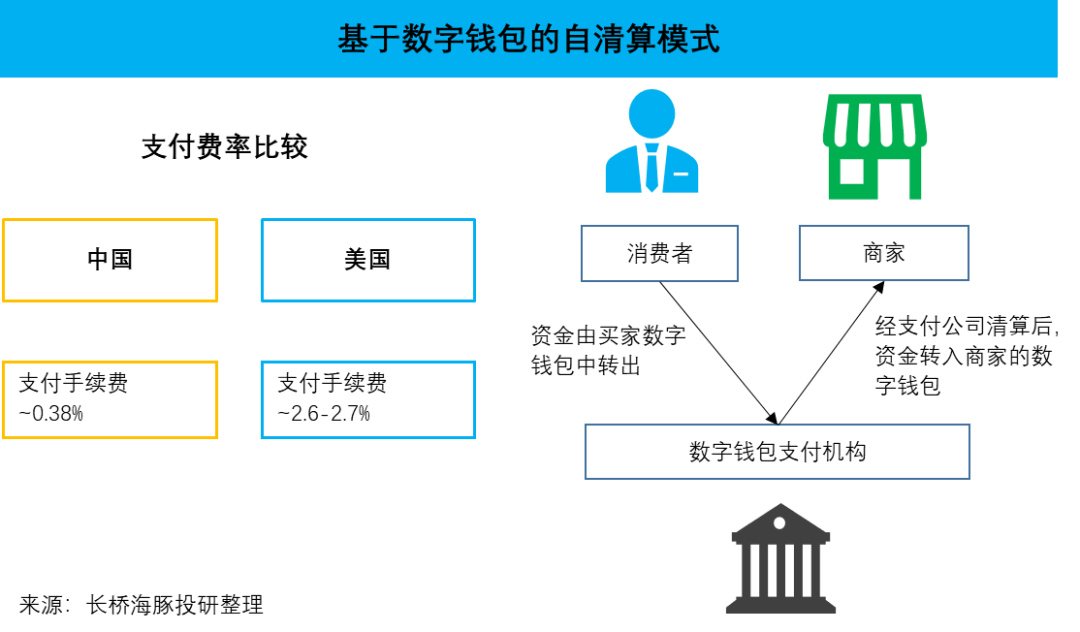 在上述支付流程外,还有三方支付机构获利更丰富的自清算模式。在这种模式下,资金直接由消费者的数字钱包账户经三方支付机构直接转移至商家的数字钱包账户,由于不再涉及消费者和商家的银行账户,以及银行间清算机构,因此数字钱包支付机构能够独占~2.6%-2.7%的支付费用,收益显著高于四方清算模式。不过自清算模式成立的前提是消费者和商家都使用同一品牌下的数字钱包。因此,只有当三方支付机构同时拥有大量C端和B端用户时才可能通过自清算模式攫取更大的收益,目前美国尚无三方支付机构能满足此要求。![]()