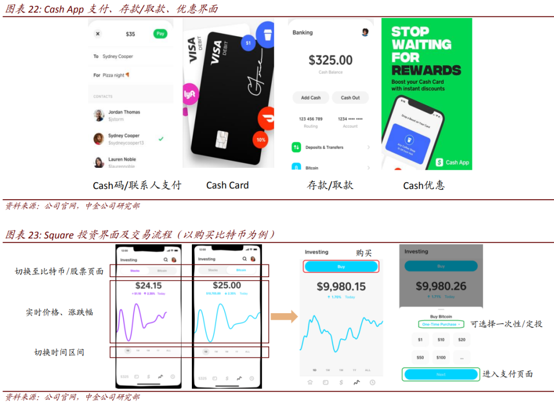 在围绕线下POS支付的2B业务体系外,自2013年Cash App上线起,Square围绕这款应用也逐步搭建起了起2C支付生态体系。在Cash App诞生之处,其功能主要为个人AA收款或P2P转账,功能相对单一。但随后,公司接连推出了① Cash Card(与银行联合发行的借记卡)添加了C2B支付的功能;② App内直接买卖股票和加密货币功能;③小额现金短贷功能,额度在20-200美元左右,无需审查。而通过2021年收购“BuyNow PayLater”服务商Afterpay,Cash App进一步整合了线上支付和分期消费功能。至此,围绕Cash App的C端支付生态也初步搭建完成。![]()
