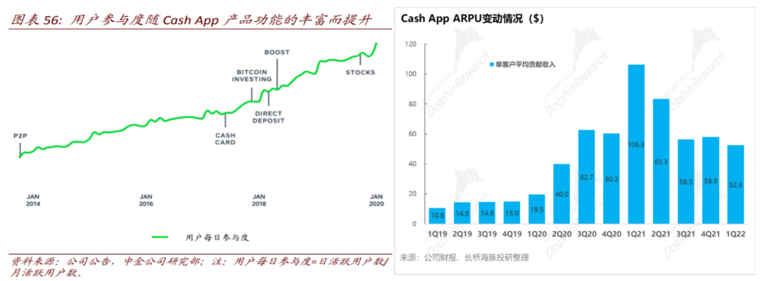 而随着Cash App功能的逐步丰富,用户使用App的频率和粘性也随之提高,公司的营收来源也不断拓展,Cash App用户人均贡献营收从18年的不到$30增长到21年的$280美元。![]()
