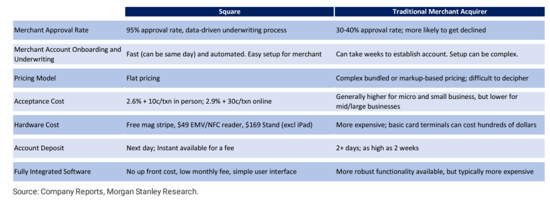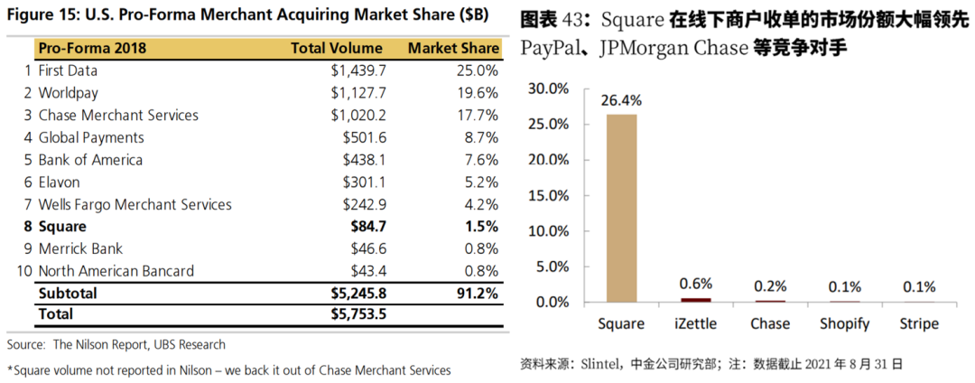 1)Square“独具慧眼”,线下2B业务领先由于Square是少数专注于线下的数字支付公司,因此在该领域有明显的规模优势。据Nilson估计,相较传统线下收单公司,Square的市占率虽然仍相当低, 在2018年占约1.5%的份额,但也已是全美第八大服务商。![]()
