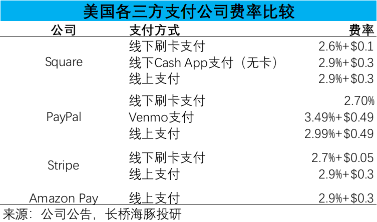 海豚君认为核心竞争点在于:支付场景,用户规模和习惯,产品线迭代速度,以及支付费率。首先,从用户感知最为直观的支付手续费率,横向对比来看各支付公司收取的费率基本相同,只有PayPal收取的费率稍稍略高。具体费率线上支付普遍在总支付金额的2.9%左右,线下支付则在2.7%左右。可见在支付手续费上打价格战并非各公司的主要竞争手段。