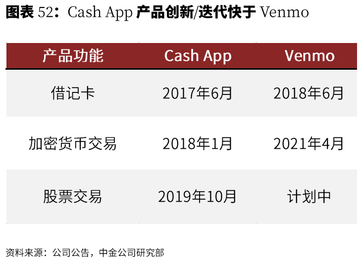 (3)Cash App产品功能迭代速度更快,能更迅速的把握目标群体的需求,并提供更丰富的功能,从而使得用户的依赖程度更高。虽然Venmo也陆续推出了联名借记卡、虚拟货币买卖服务,但节奏始终落后于Cash App。![]()
