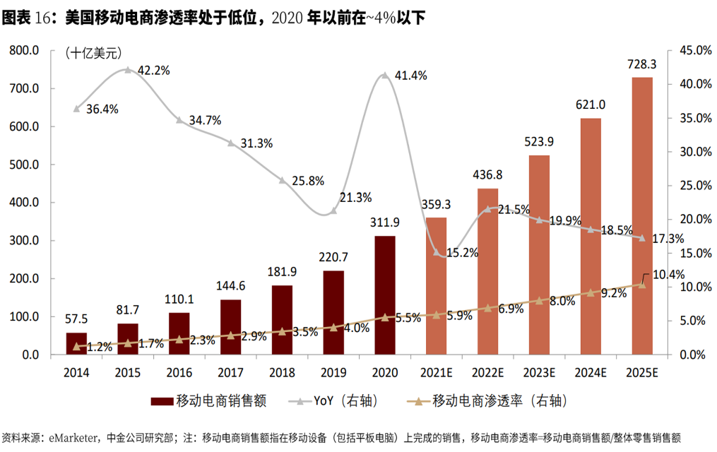 2)电商特别是移动电商的发展程度对促进移动支付有重要推进作用,支付宝和微信支付成功的原因之一是两方旗下分别有京东、淘宝天猫等稳定的线上支付场景,进而逐渐渗透至线下场景。而美国线上销售的占比本就较低,移动电商渗透率更是仅有个位数,多数线上消费通过PC端,因此数字钱包的使用场景并不高。电商市占率40%以上的亚马逊在美国也并不支持PayPal等第三方公司,进一步减少了数字钱包的使用频率。因此,在电子钱包在线上支付都不能占据主导,就更难向线下渗透。![]()