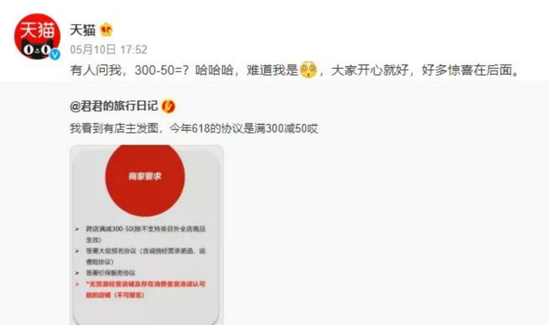 今年618,天猫的跨店满减规则是满300减50,是近五年来淘宝促销的最大值,京东则是满299减50,也比去年双11满200减30力度更大。不过羊毛出在羊身上,平台少赚消费者的钱,势必会出现在压缩商家的利润上。但还是有不少品牌商家争先恐后试图在上半年的最后关头提一波业绩。