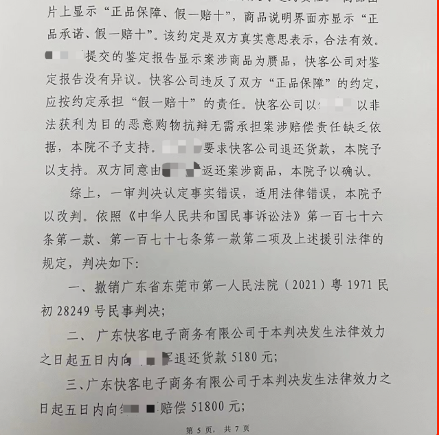 随后由此引发了一系列诉讼案,在消费者提供的法院判决书中清晰显示KK集团存在售假和欺诈消费者的行为,法院并且判定其应按约定承担“假一赔十”的责任。