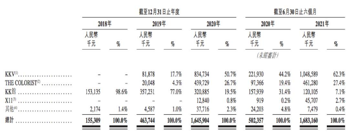 此消彼长的是,KK集团另一零售品牌——KKV开始逐渐崛起,在2018年营收贡献为0的情况下,2019年收入0.82亿元,占总总营收的17.7%,2020年KKV收入增至8.35亿元,占当期总营收的50.7%,2021年上半年持续增长至10.49亿元,当期的营收占比增长至62.3%。