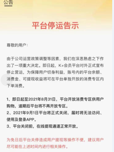 不知道是否因为此次消费集体维权事件所致,2021年7月,K+会员发布公告称,将进行全面升级,升级期间暂停服务。此后不久,K+会员再次宣布平台将关停。是蓝天等消费者推倒了多米诺骨牌,还是KK集团对自身售假行为心知肚明,害怕有更多的蓝天来主张“假一赔十”,而主动关停平台,就不得而知了。但根据平台公告,这或是一次无限期关停,目前并没有给出启动的具体时间。