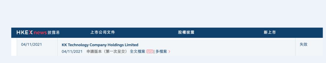 2021年11月4日,KK集团向港交所递交招股书,至今已经超过半年。按港交所规定,半年未能通过聆听其招股书及其它材料自动失效。但这不等于公司终止上市流程或港交所驳回上市申请,也就不意味着上市失败,只需在3个月内补充最新财务报告即可重新启动上市流程。