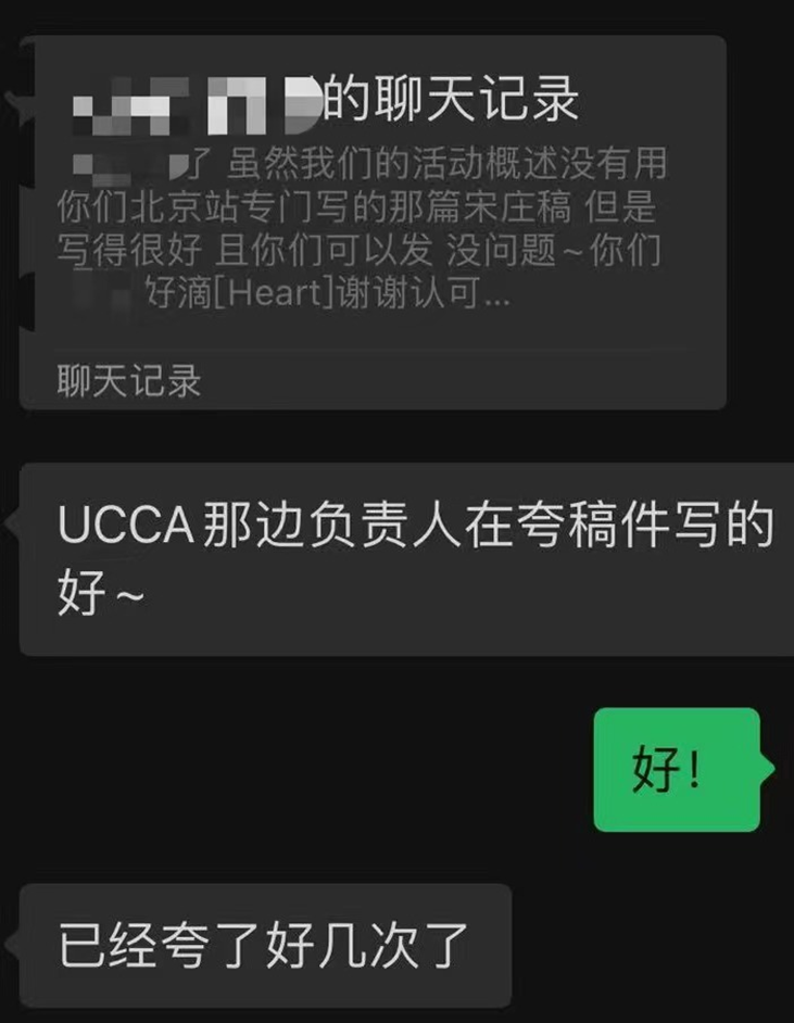 吕瑶写的公众号文章得到UCCA的数次夸奖