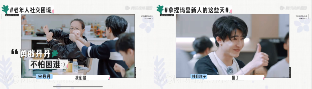 《桃花坞2》以“尴尬社交”破题,并不是要拿“明星尴尬片段”当哗众取宠的噱头搏话题眼球,节目是在透过明星相处构筑一个群体社交实验,一期节目里分part提出“初相识要如何破冰”、“新人如何融入老人小团队”、“老年人社交困境”等社交议题,遇到高能尴尬场面时及时跳出“社交小tips”的提醒,帮助观众思考、厘清相同情境下“怎么做到更好”。