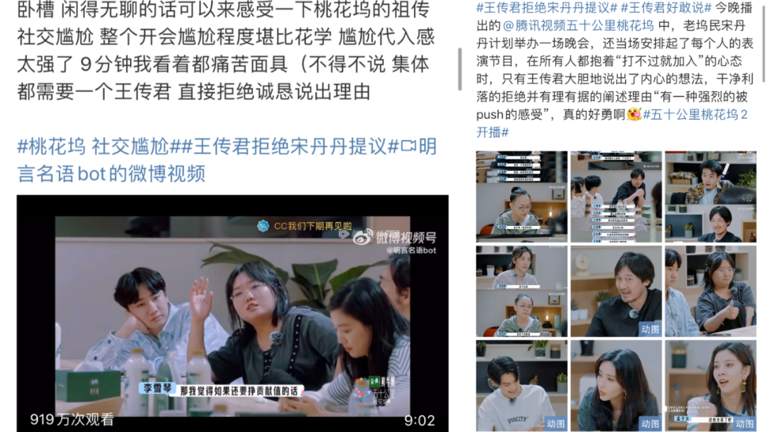 拿《桃花坞2》为例,“尴尬九分钟”片段经由各类渠道传播、被各种娱乐号主观解读,反复在众人心里强化“尬综”、“宋丹丹强势”、“王传君孤勇”等心理暗示,使得舆论场充斥着太多相似的声音,但却忽略了节目本身一直在强调的社交实验意义。