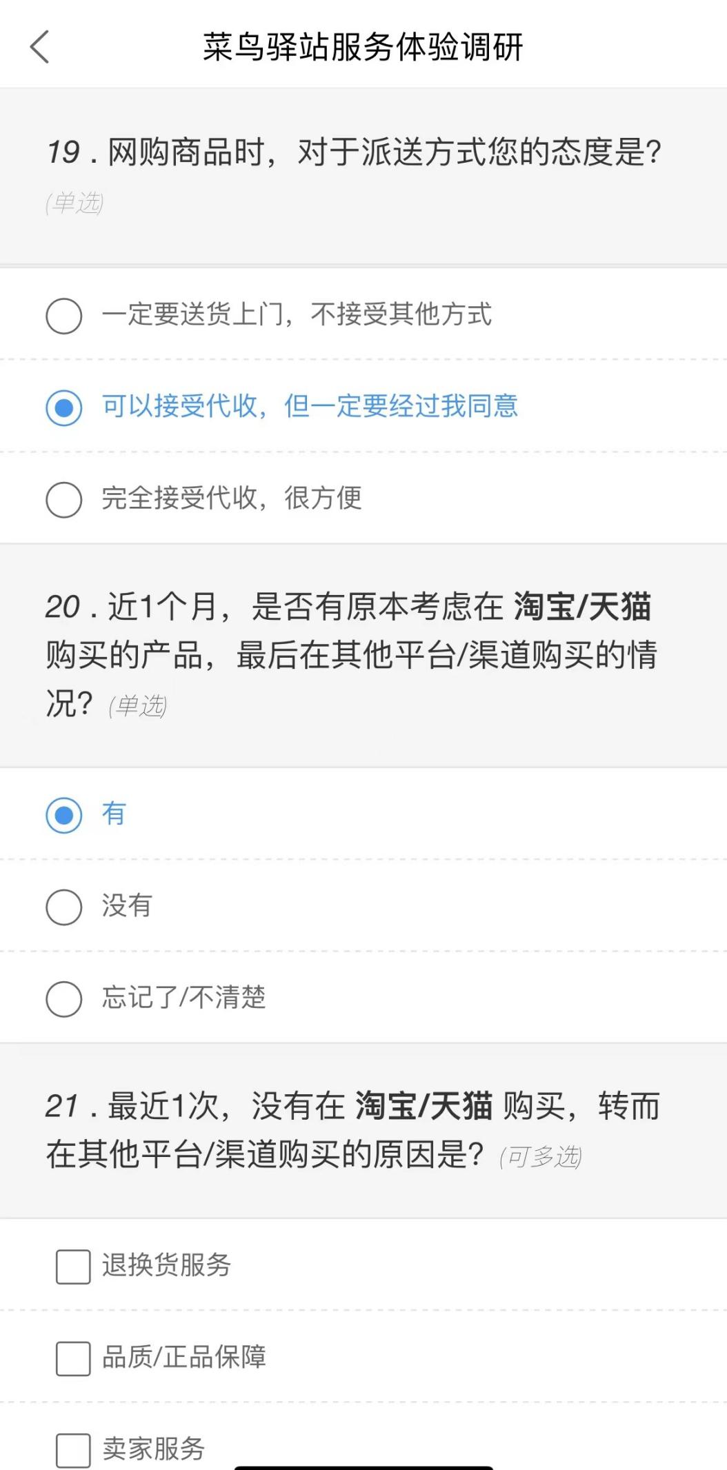与此同时,最近菜鸟面向用户推出的一则《驿站服务体验调研》,也能佐证其大举发力送货上门服务的野心。在该问卷调查中,问题包括“对包裹放在菜鸟驿站的看法是”“可以接受的网购派送方式”“有没有使用过菜鸟驿站的送货上门服务”“除菜鸟驿站之外还在哪些地方存放过包裹”“取包裹时是否遇到过关门的情况”等......基本都是围绕“送货上门”这个关键词展开,且还可以看出菜鸟试图就送货上门服务的缺失,探究其是否会影响用户对购物平台的选择。