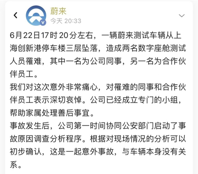 6月22日,17时20分左右,一辆蔚来测试车从停车楼三楼坠落,事故导致两名数字座舱测试人员罹难。生命、新能源汽车、蔚来,每一个词汇都将关注度放大,而在这一过程中,蔚来的回应迅速引爆了舆论。![]()