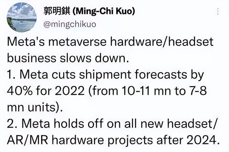 此外据知名硬件分析师郭明琪的爆料称,Meta将22年出货量预测下调了40%,并且搁置24年以后新的耳机/AR/MR项目,从这一角度来看,小扎的元宇宙构想也确实还处在逆风期。