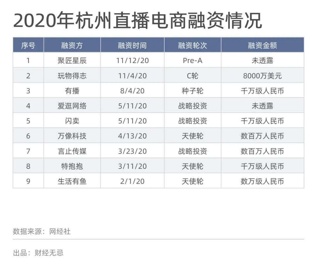 资本也嗅到了机遇。数据显示, 2020年中国直播电商领域共有23家平台获得融资,融资总额超11.7亿元,杭州占据了一半。 聚匠星辰、特抱抱、万像科技等直播电商机构背后站着的是小米科技、梅花创投等明星资本。