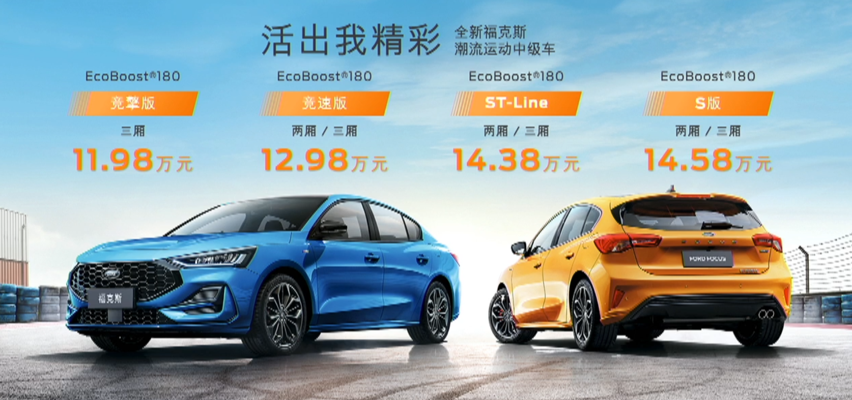 全新福克斯提供三厢和两厢两种车身形式;同时,提供6种车身颜色,包含传承福特经典性能车型颜色的掠星蓝、炽火橙、机甲灰,以及硬核灰、烈焰红和钛空白,其中,炽火橙和机甲灰更是福特首次在中国发布,满足年轻消费者潮流个性的审美需求。